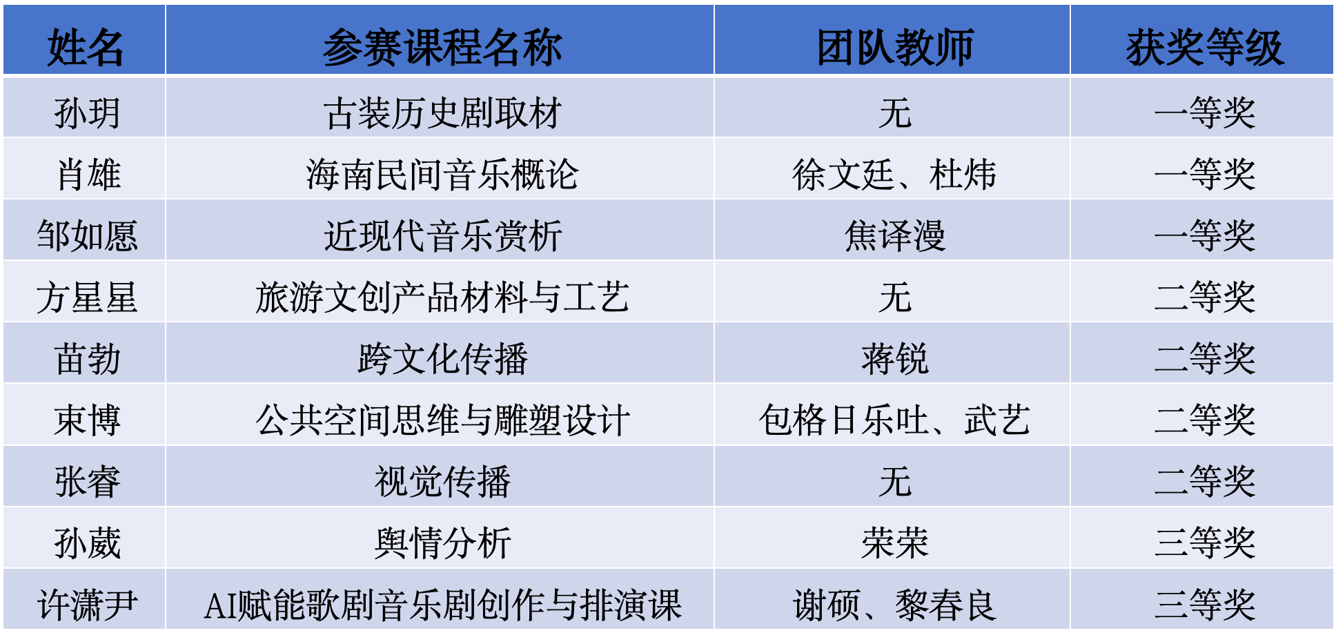 今年会官网教师结合自身教学实践,围绕“AI赋能课程建设”,将AI图像、视频生成、剪辑、三维建模、数字人、大数据等技术与中国优秀传统文化、音乐、设计、大众传播等议题结合,积极参赛,斩获佳绩。孙玥、肖雄、邹如愿荣获一等奖,方星星、苗勃、束博、张睿荣获二等奖,孙葳、许潇尹荣获三等奖。