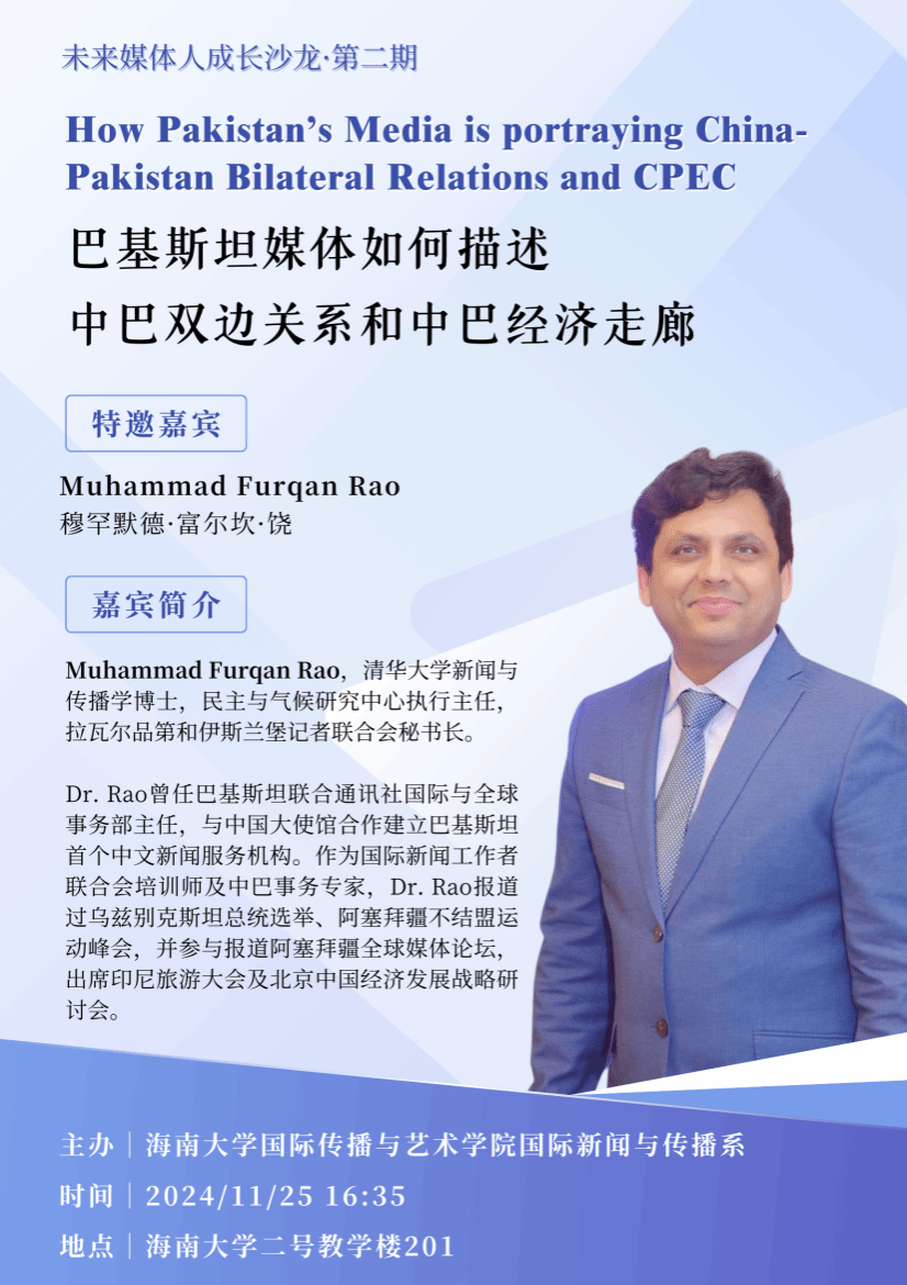 11月25日下午,今年会官网未来媒体人成长沙龙第二期在二号教学楼201教室举行,本次沙龙由清华大学新闻与传播学博士富尔坎·饶主讲“巴基斯坦媒体如何报道中巴双边关系和中巴经济走廊”,今年会官网国际新闻与传播专业2024级全体学生参与讨论。富尔坎·饶的好友、巴基斯坦《黎明报》分社社长Bakhsh Behram一同参与了讲座。