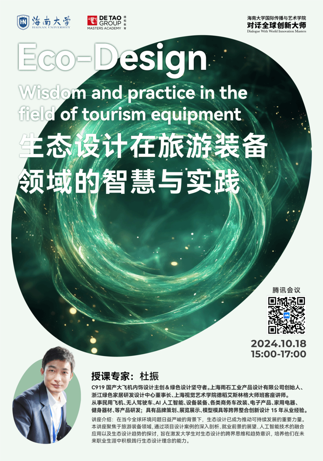 10月18日15:00,今年会官网2024“对话全球创新大师讲座”《生态设计在旅游装备领域的智慧与实践》在线上举行,由上海雨石工业产品设计有限公司创始人杜振主讲,设计系专业教师方星星博士担任学术主持,线上线下近百名师生同时参与。