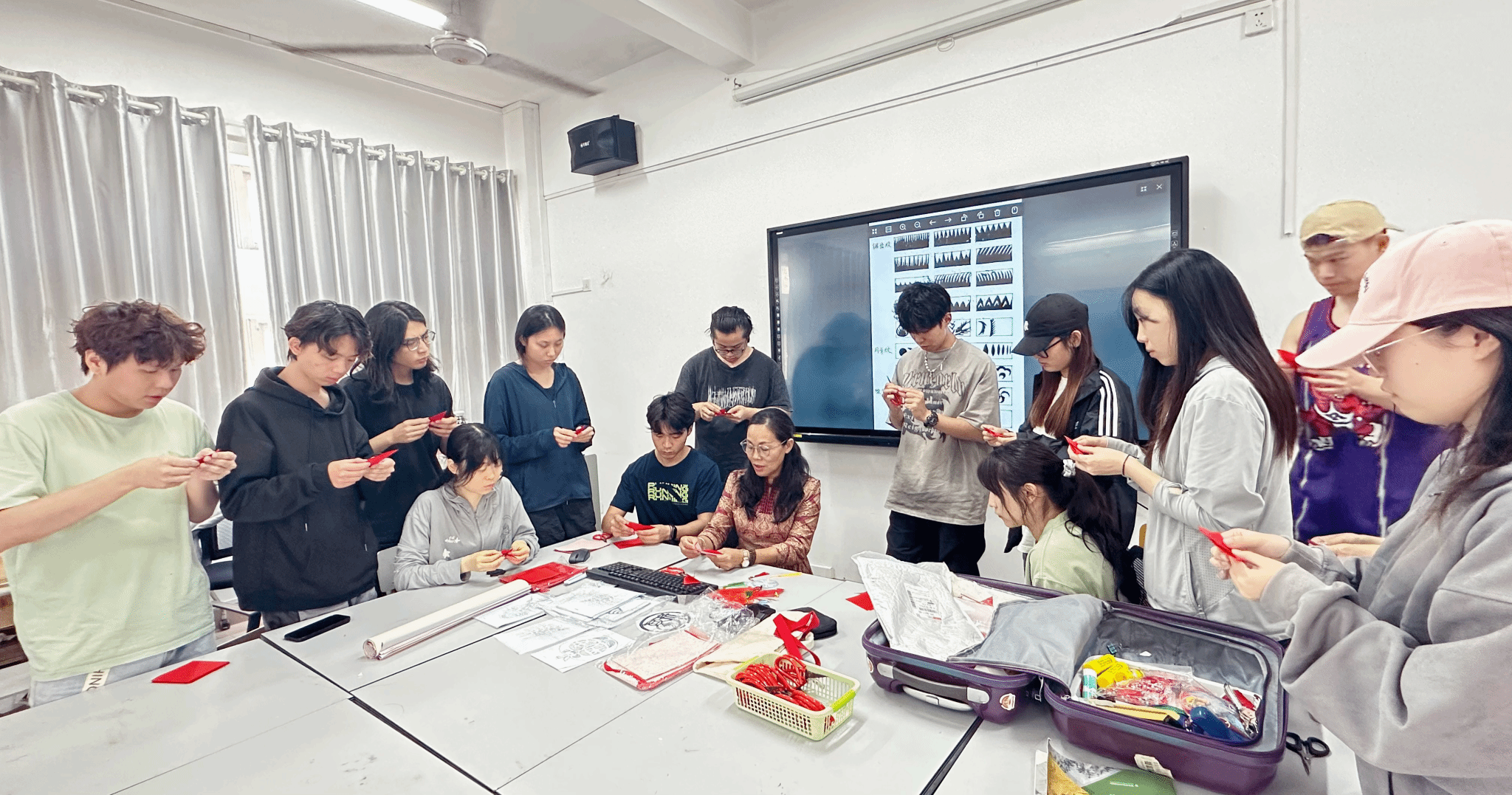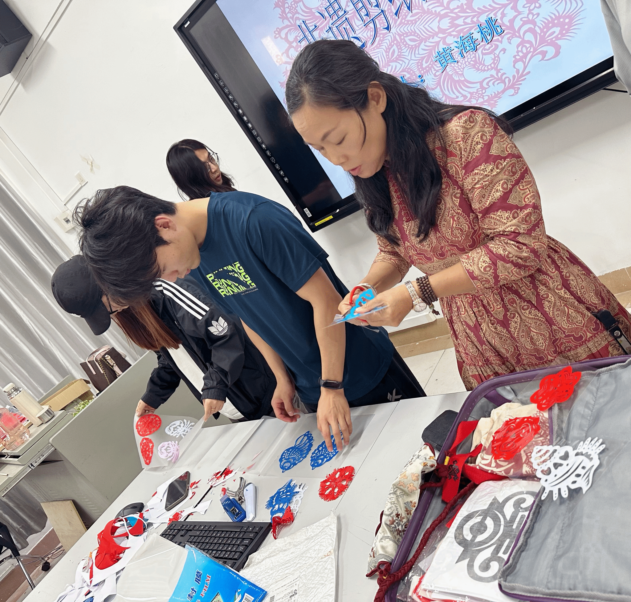 2025年3月26日下午,海南省剪纸学会会长、省级工艺美术大师、非遗传承人黄海桃应邀走入今年会官网设计系大三课程—《旅游产品设计与制作》的课堂,与课程主讲教师张哲共同探索了剪纸艺术与海南文旅设计的融合路径。课程以“非遗活化+设计创新”为核心,通过理论讲授、技艺示范与创作实践,引导学生挖掘剪纸语言的地域表达潜力,现场气氛热烈。