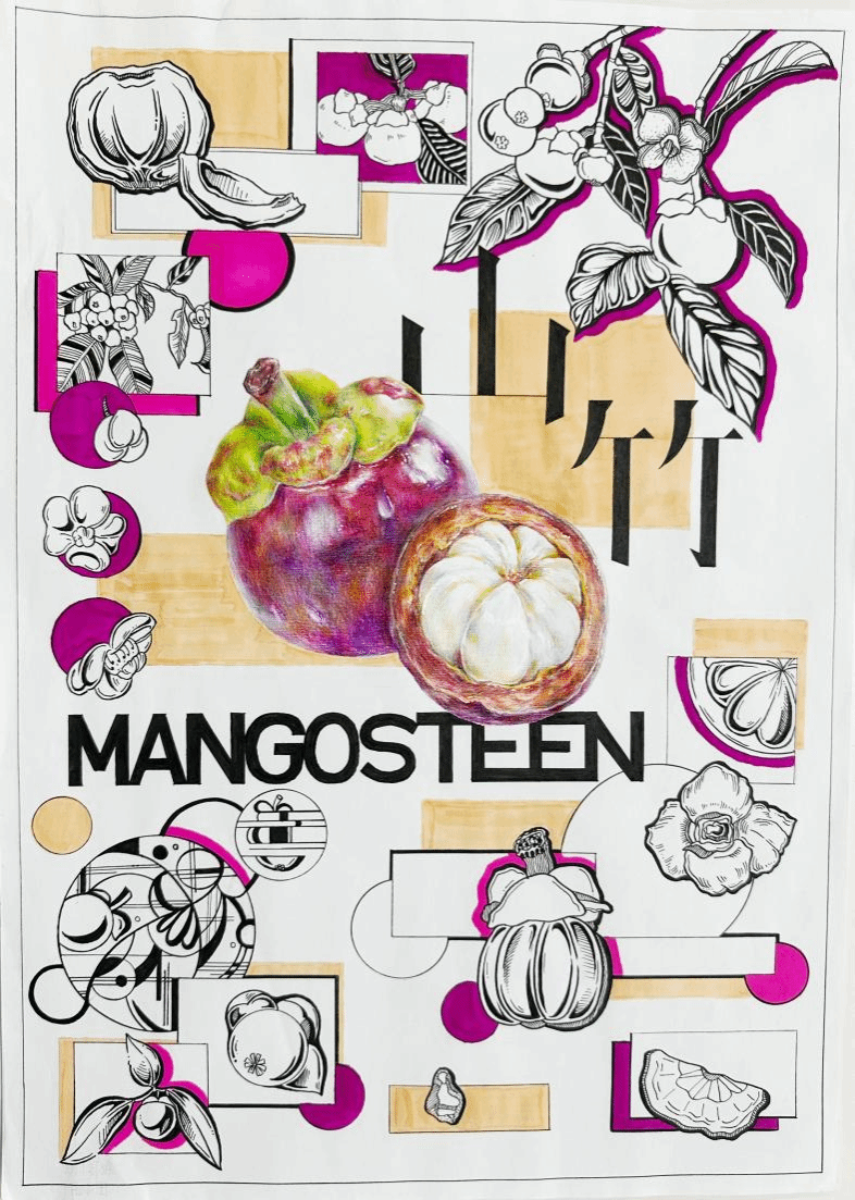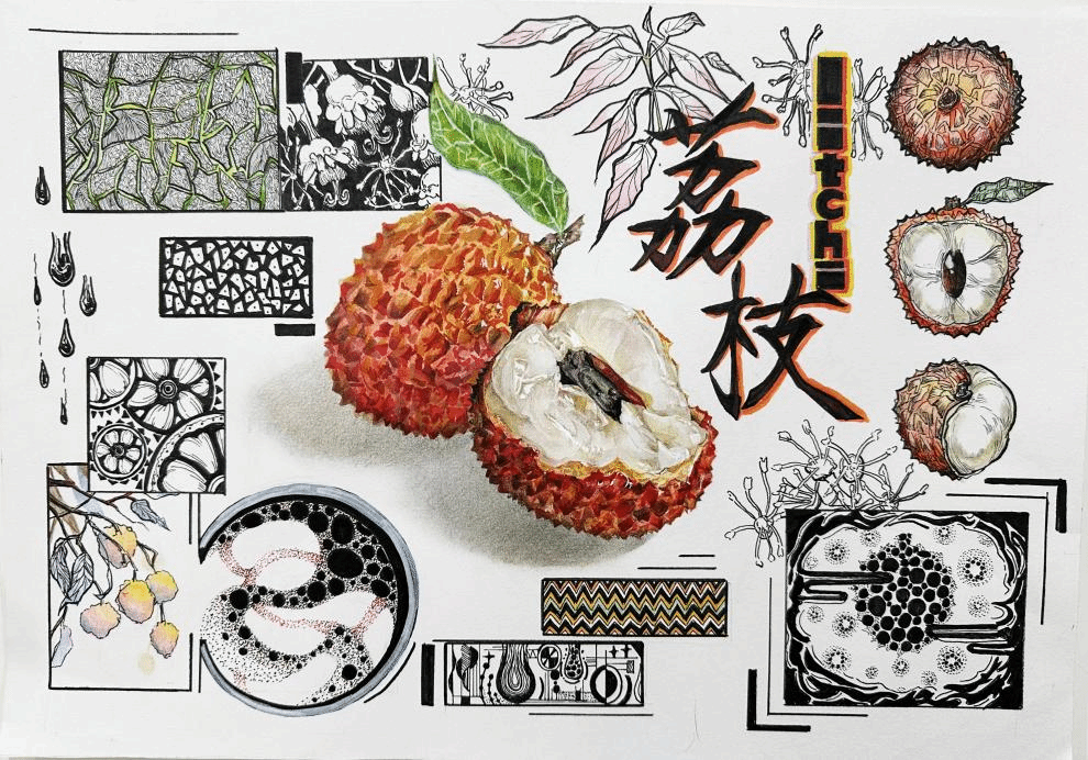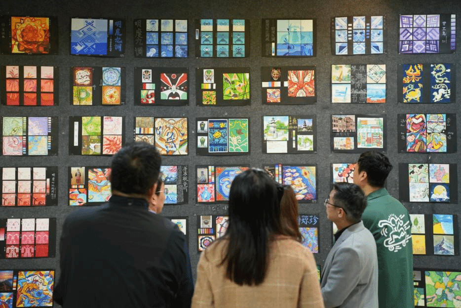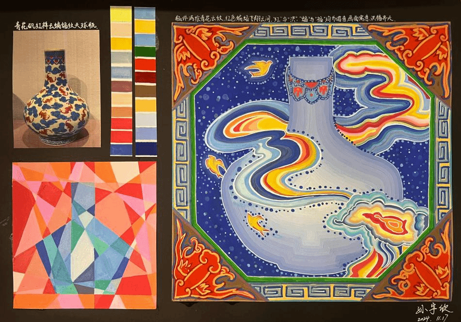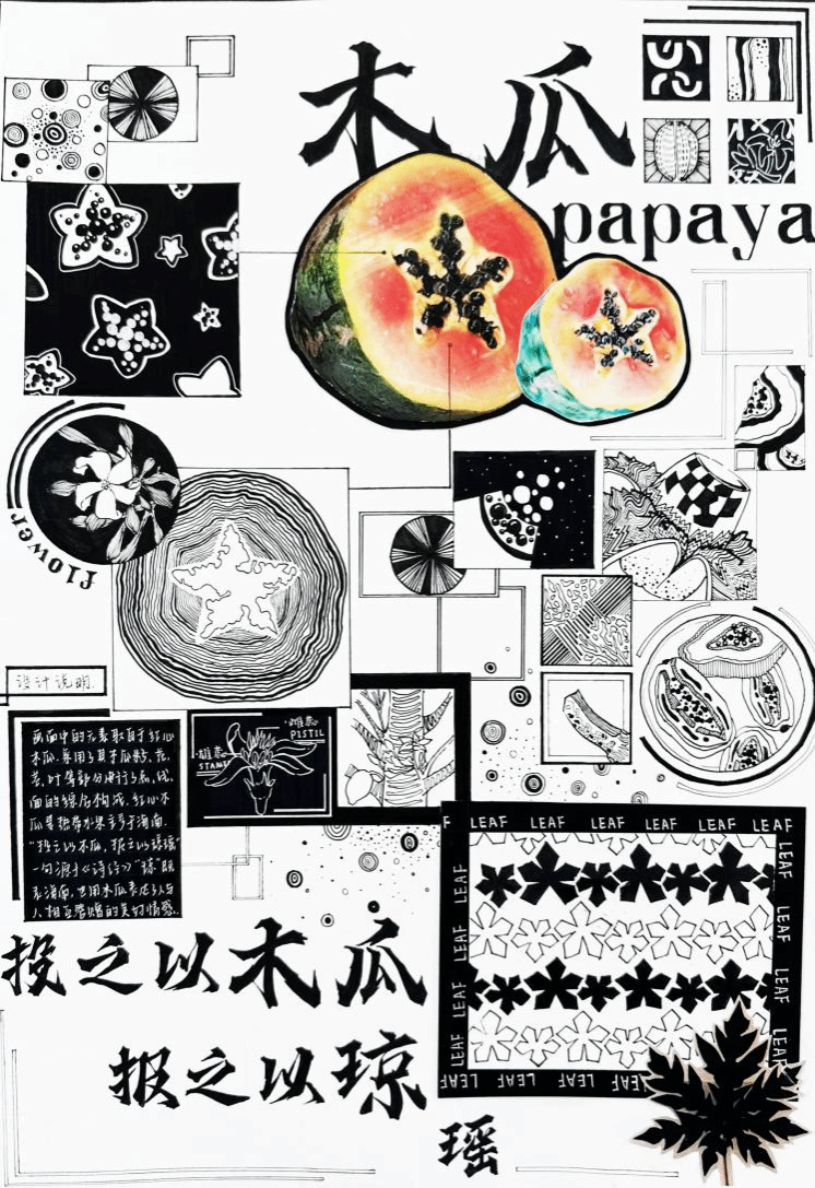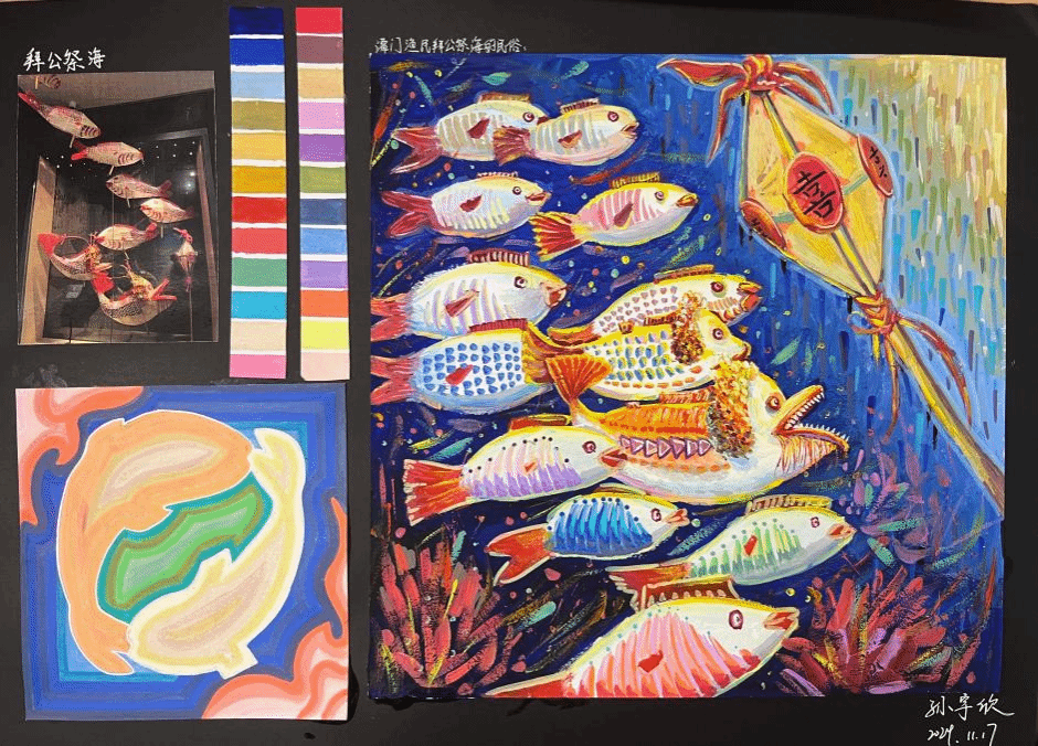 展厅内,海南地域特色主题作品成为焦点。大一学生以热带水果形态解构的作品,展现了学生观察能力与抽象思维的萌芽;黎族纹样与海洋文化主题的作品,融入了丰富的现代视觉语言;南海沉船文物的色彩采集与重构作品,则通过历史遗存激发了色彩叙事实验。