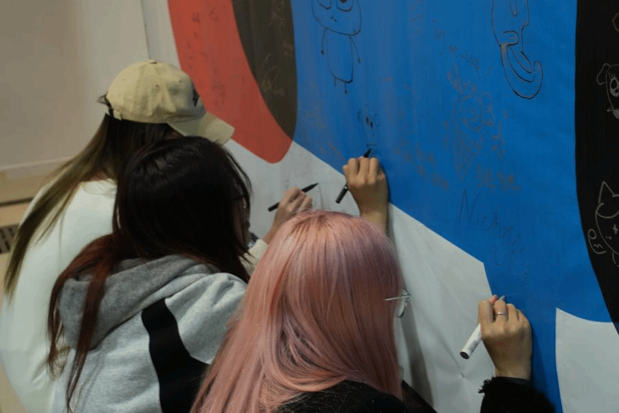 展览强调“开放性”与“未完成性”,将课堂作业视为教育成长的切片,从字体设计的笔画结构推演至动态海报交互,从基础构成延展至社会议题解决方案,展现了学生思维从稚嫩到成熟的蜕变轨迹。展览结语部分的互动区也留下了参观者的涂鸦作品,共同构筑本次“开放式”美育展览活动。