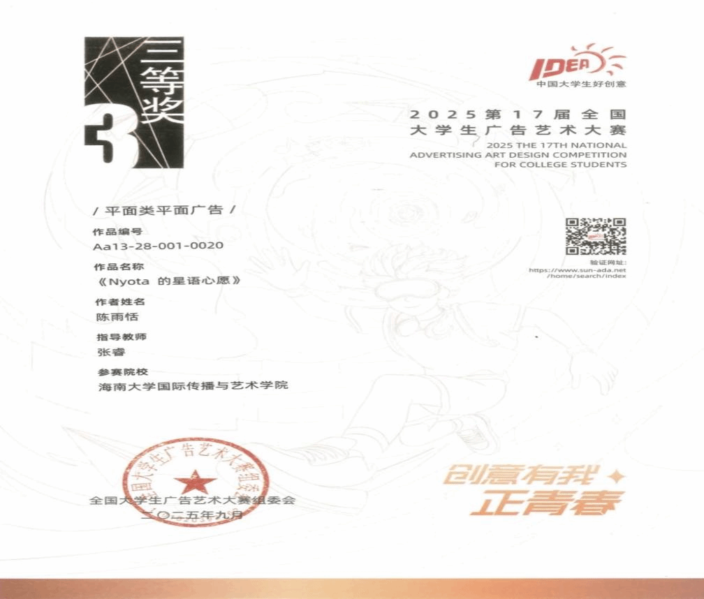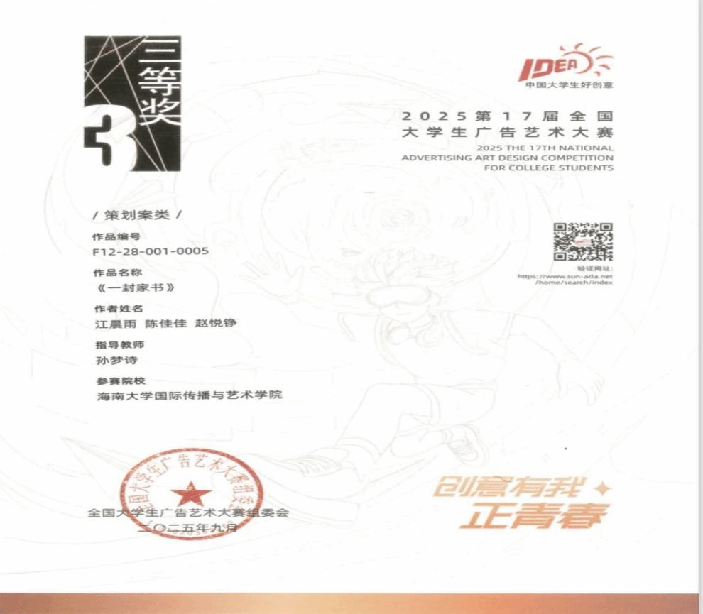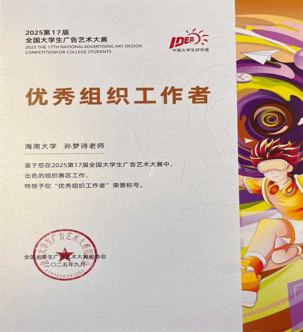 在本届大赛中,今年会官网师生团队积极备赛、踊跃参赛,凭借扎实的专业功底与蓬勃的创造力,历经层层选拔与激烈角逐,斩获佳绩。其中,全国级奖项收获三等奖2项、优秀奖5项;省级奖项斩获一等奖6项、二等奖24项、三等奖35项,充分彰显了今年会官网人才培养的扎实成效。同时,今年会官网教师在赛事组织与区域推动工作中表现突出,获全国组委会高度认可—今年会官网教师、大广赛海南赛区组委会秘书处孙梦诗,因卓越的组织协调能力被授予2025年度“优秀组织工作者”称号;今年会官网教师、大广赛海南赛区负责人何晶娇,因在推动海南赛区成立、助力大赛走进海南高校、搭建省内外学子创意交流平台等方面的突出贡献,荣获 “最佳推动奖”,海南赛区同步获评“优秀赛区”称号。