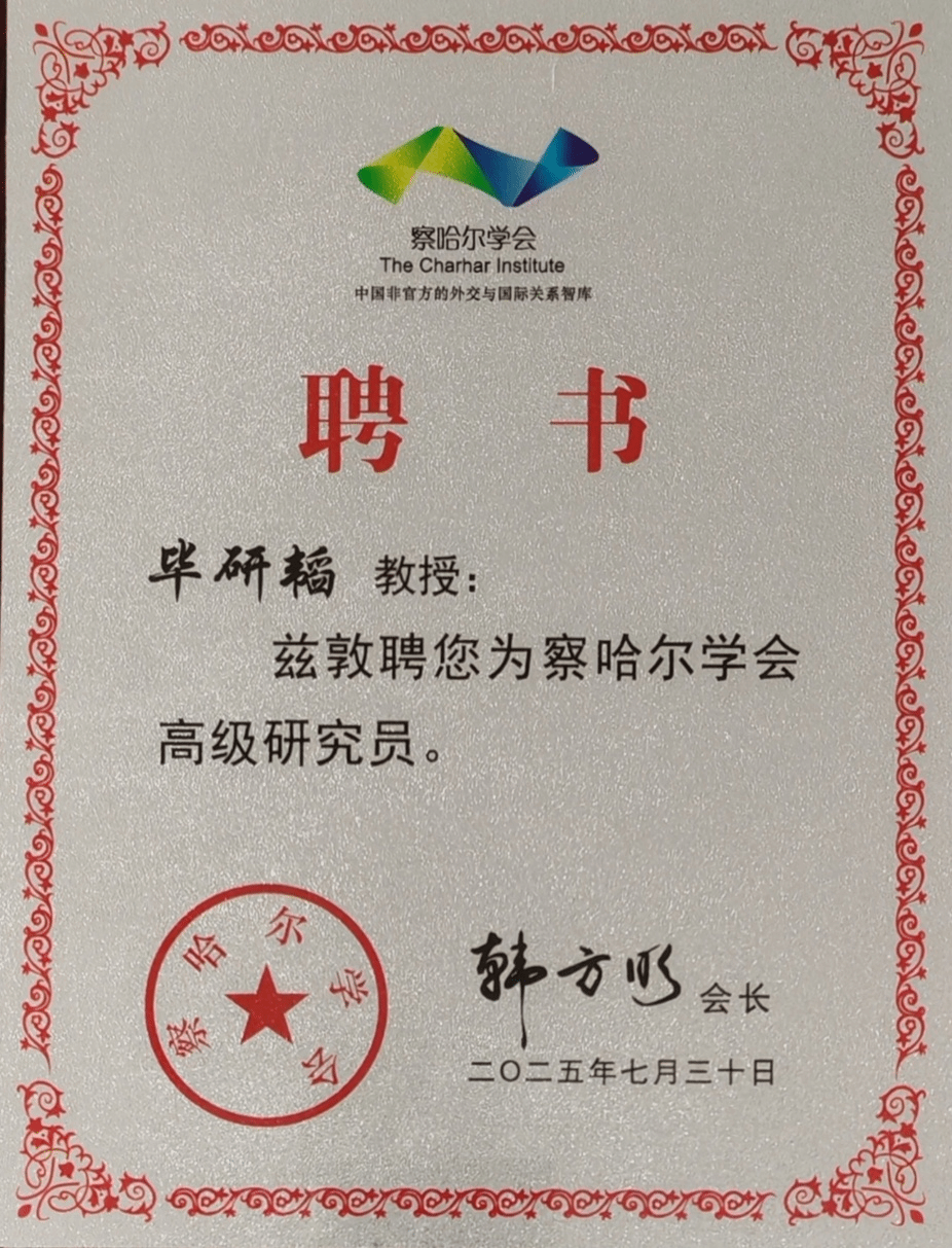 近日,今年会官网传播学系毕研韬教授受聘为察哈尔学会高级研究员。