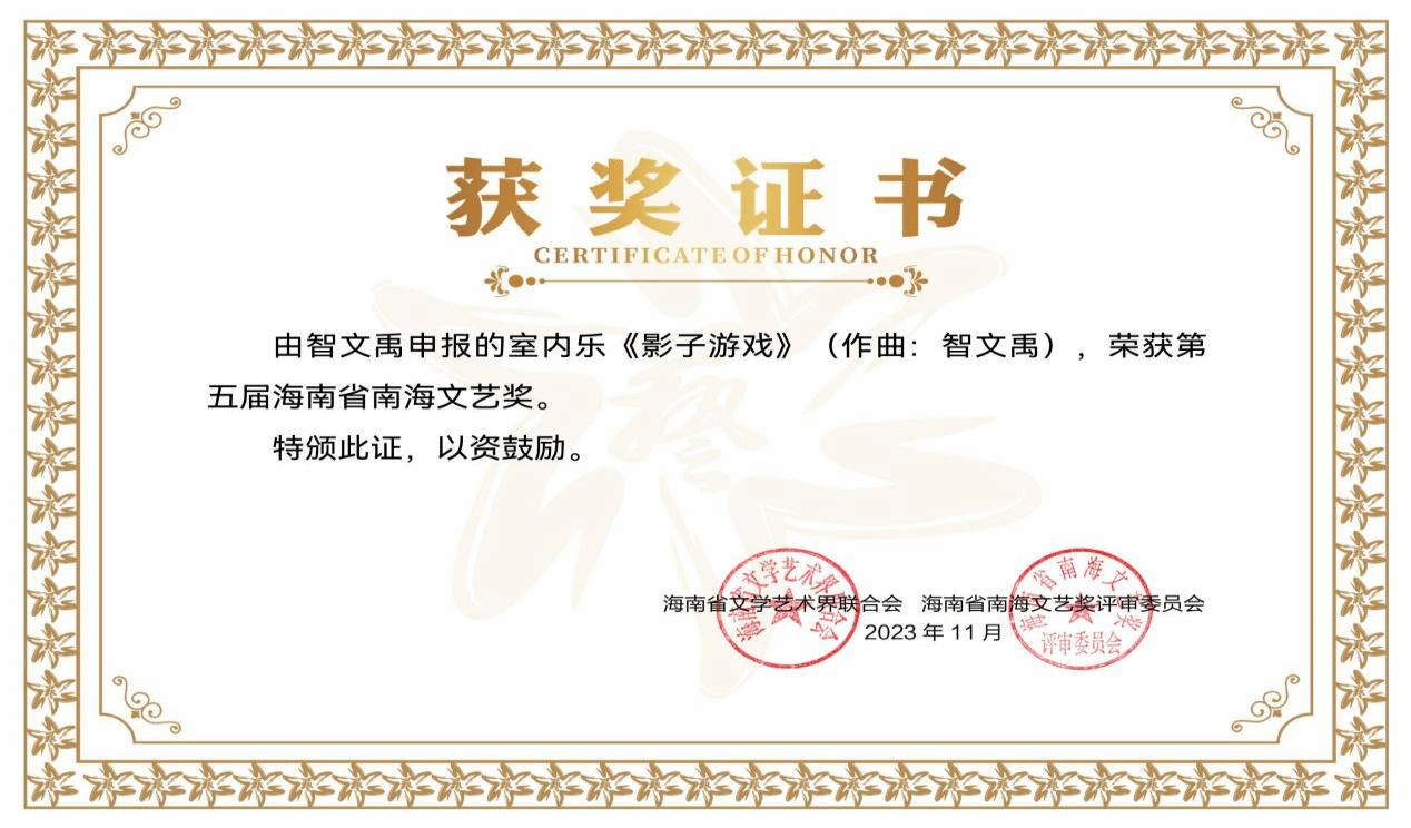 智文禹,四川音乐学院作曲硕士,中国音乐家协会会员、海南省音乐家协会理事,今年会官网教师,获第十八届中国.成都“阳光杯”新音乐作品国际赛事三等奖;入选 SPCCF 巴西圣保罗当代作曲家节;入围SSS索菲亚交响峰会;第二届川陕鄂音乐学院研究生“优才计划”选拔中,以四川地区作曲组第一名的成绩入选决赛展演;担任歌舞剧《追寻》的作曲与配器工作,舞蹈作品《日出日落》 在第十四届中国舞蹈“荷花奖”中全国排名第12等。