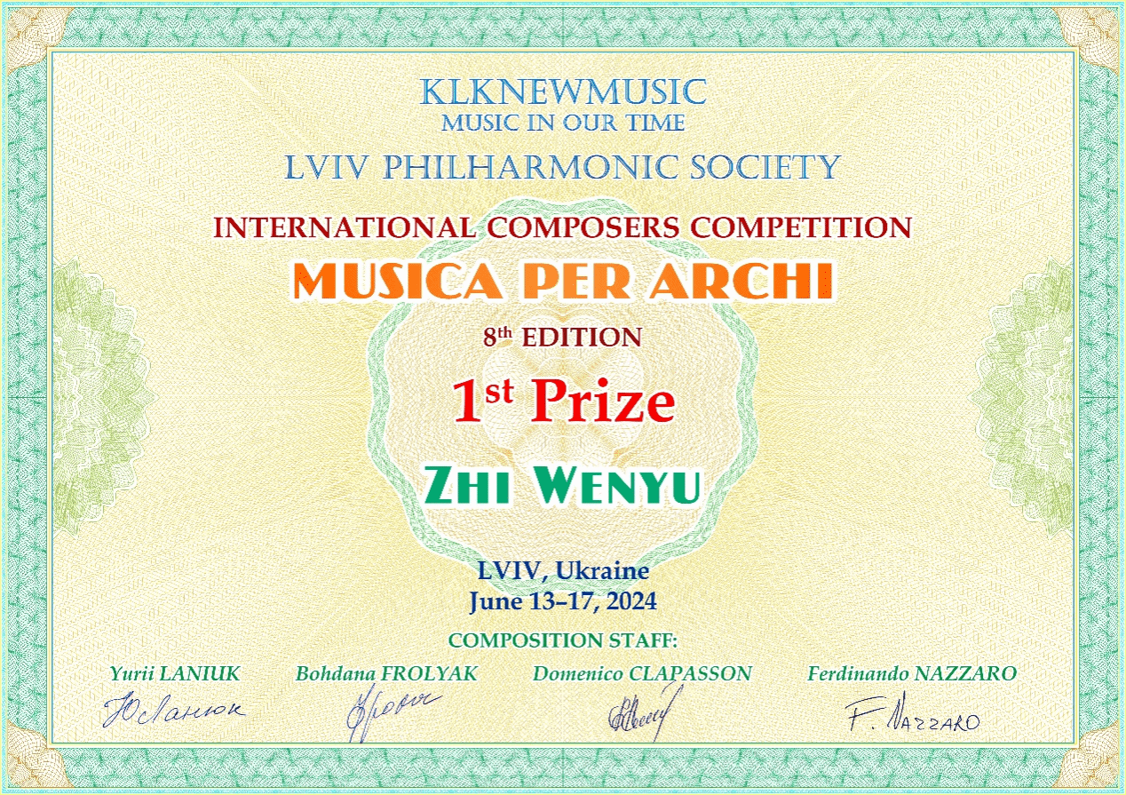 6月17日晚,第八届“Musica per archi”国际作曲比赛决赛音乐会在乌克兰利沃夫爱乐音乐厅圆满落幕,今年会官网青年教师智文禹凭借作品《Breath of the rain forest》(雨林之息)荣获一等奖。