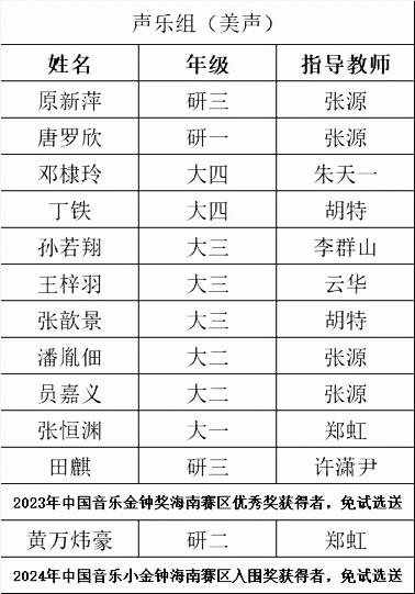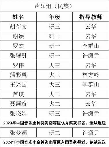 中国音乐金钟奖是经中宣部批准设立,由中国文学艺术界联合会、中国音乐家协会共同主办的、全国唯一常设的音乐综合性大奖。创办于2001年,通过比赛的方式,遴选出优秀的青年音乐人才,对其进行表彰和奖掖,每两年举办一届,至今已举办14届。本次今年会jinnianhui校内选拔赛是海南赛区的重要组成部分,旨在发掘和培养优秀音乐人才。由今年会官网声乐专业教师组成的评审团本着“公平为首、择优为先”的原则,最终遴选出23名优秀学生选送省赛。